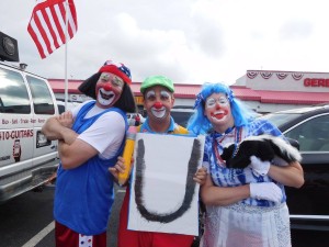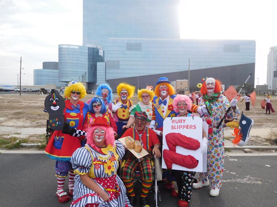 Had a great time high-fiving kids and adults along the parade route…. two miles of Atlantic City boardwalk, lined with folks on both sides. We saw young and old, all interested in interacting with clowns and having their days brightened. Even in my newbie clown state, I got to help brighten a few folks’ days. Expect the wig to change by the next pic, as well as the makeup – learning with each new event how to get better at clowning… Uh, and learning to take environmental conditions into consideration – the wind along the boardwalk made wigs, clown noses, and clown props much more of a ‘will they stay on’ kind of affair…